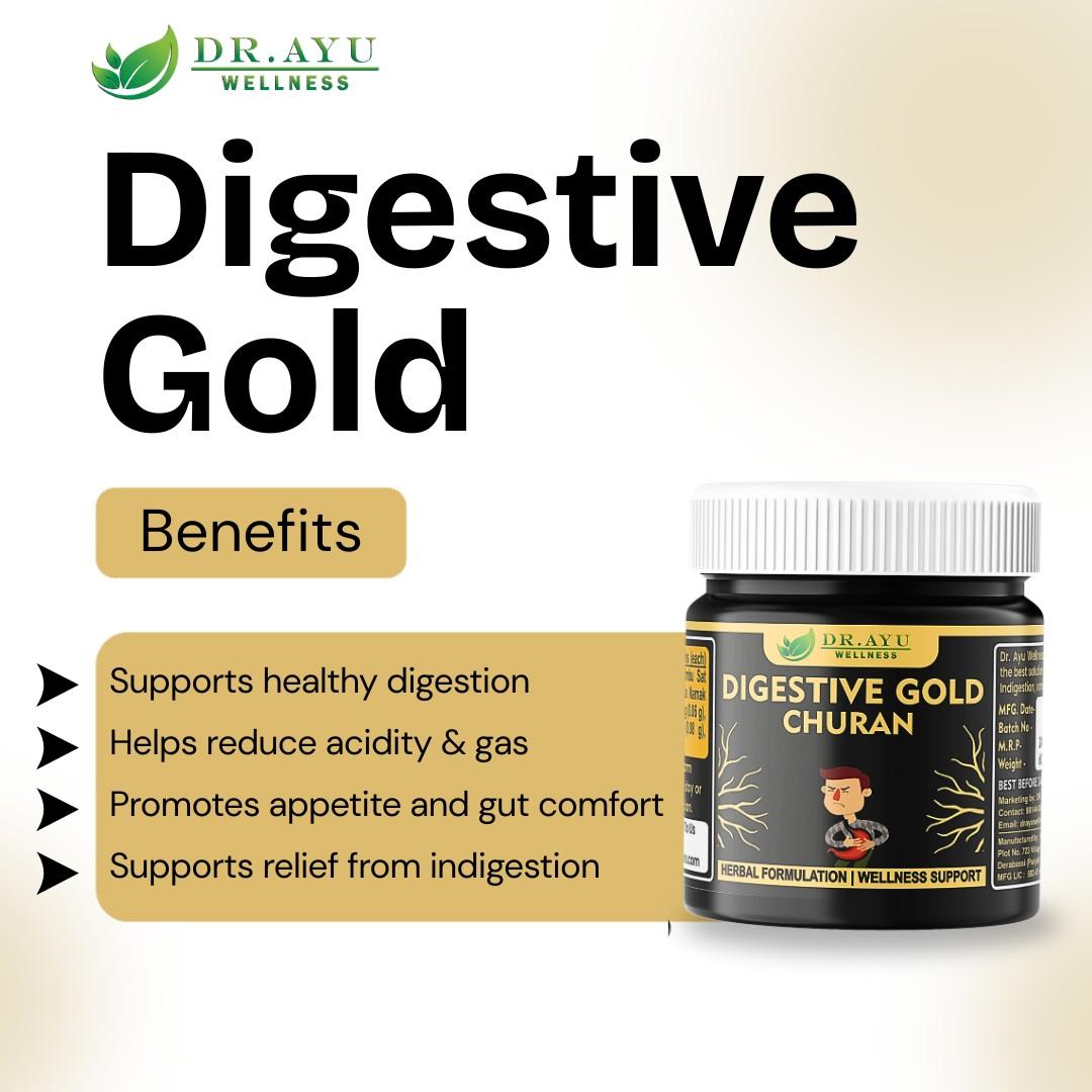 Dr Ayu Wellness Digestive Gold Churan is an Ayurvedic herbal formulation crafted to support healthy digestion and overall gut wellness. Enriched with traditional ingredients like Jeera, Hing, Saindha Namak, and Pudina Sat, it helps maintain digestive balance and supports relief from common issues such as gas, acidity, and bloating. Regular use may help improve appetite and promote smooth digestion after meals. This herbal churan is suitable for daily use and works gently to support digestive comfort when taken as directed by a physician.