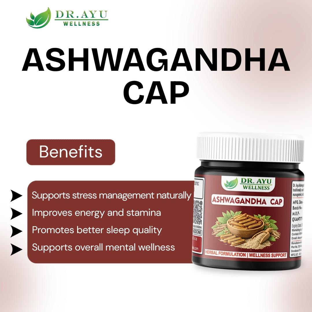 Dr. Ayu Wellness Ashwagandha Capsules are an Ayurvedic proprietary formulation designed to support overall health, vitality, and wellness. Made with high-quality Ashwagandha (Withania somnifera), a well-known adaptogenic herb in Ayurveda, this supplement helps the body adapt to stress, promotes mental balance, and supports physical strength. Ashwagandha has been traditionally used in Ayurvedic practices for centuries as a Rasayana (rejuvenating herb). It is valued for its ability to help maintain energy levels, improve stamina, and support overall wellbeing. Regular use may help promote a calm mind, better sleep quality, and enhanced resilience to daily stress. These capsules are formulated to support both physical and mental wellness without harsh chemicals. They may help maintain cognitive clarity, reduce occasional fatigue, and support the body’s natural strength. The formulation is suitable for adults looking for a natural way to support their lifestyle, especially those dealing with busy routines, mental stress, or low energy levels. Ashwagandha is also known for its antioxidant properties, which help protect the body from oxidative stress. It supports immune health and helps maintain overall balance in the body. This makes it a valuable addition to daily wellness routines. Dr. Ayu Wellness ensures that the product is manufactured following Ayurvedic principles and quality standards. The capsules are easy to consume and designed for better absorption. With consistent use as per recommended dosage, individuals may experience improved vitality, better stress management, and enhanced overall wellness. This product is not intended to diagnose, treat, cure, or prevent any disease. It is an Ayurvedic supplement meant to support general health and wellbeing when used as directed.