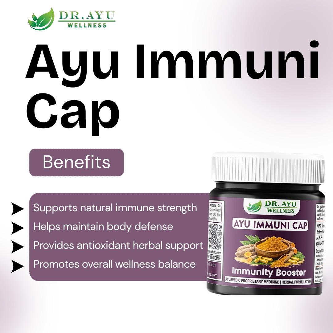 Ayu Immuni Cap by Dr. Ayu Wellness is a thoughtfully formulated Ayurvedic proprietary supplement designed to support overall immune health and well-being. Rooted in the principles of Ayurveda, this herbal formulation combines the goodness of traditionally used ingredients like Giloy (Tinospora cordifolia), Ashwagandha (Withania somnifera), Amla (Emblica officinalis), Aloe Vera, and Haldi (Curcuma longa), each known for their beneficial properties in maintaining body balance and vitality. In today’s fast-paced lifestyle, factors such as stress, poor diet, environmental pollutants, and irregular routines may weaken the body’s natural defense mechanisms. Ayu Immuni Cap is designed to help maintain immune balance and support the body’s natural response to external factors. The formulation includes Giloy, widely recognized in Ayurveda for its role in supporting immunity and detoxification, while Ashwagandha helps in managing stress and promoting overall strength. Amla, a rich natural source of Vitamin C, contributes to antioxidant support and helps protect cells from oxidative stress. Haldi (Turmeric) is traditionally valued for its anti-inflammatory and antioxidant properties, supporting joint comfort and general wellness. Aloe Vera further complements the formula by aiding digestion and supporting internal cleansing processes. This combination works holistically to support not just immunity but also overall health, including digestive wellness and energy levels. Regular use, along with a balanced diet and healthy lifestyle, may help maintain vitality and improve general well-being. Ayu Immuni Cap is suitable for adults seeking a natural way to support their immune system. It is made using carefully selected herbal extracts and follows quality standards aligned with Ayurvedic principles. The product is easy to consume and can be incorporated into daily routines. This Ayurvedic proprietary medicine is intended to support health and wellness and should be used as directed. It is always advisable to consult a qualified healthcare professional before starting any supplement, especially for individuals with pre-existing conditions, pregnant or lactating women.
